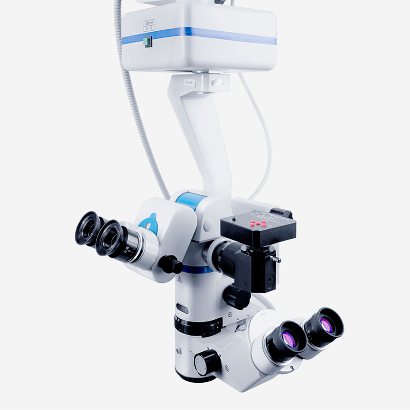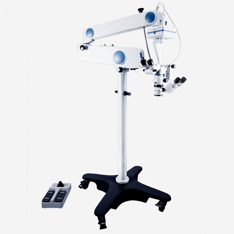 This surgical microscope features a manual 3-step magnification system providing 6x, 10x, and 16x magnification with a 50 mm focusing range. It includes a 45° binocular tube, adjustable 55–75 mm interpupillary distance, and ±6D diopter adjustment for comfortable viewing. The halogen illumination system delivers up to 60,000 lux with 10-step brightness control, built-in retinal protection, and adjustable red reflex. A stable floor stand with 1100 mm arm extension and foot switch controlled motorized X-Y movement ensures precise positioning for surgical applications.