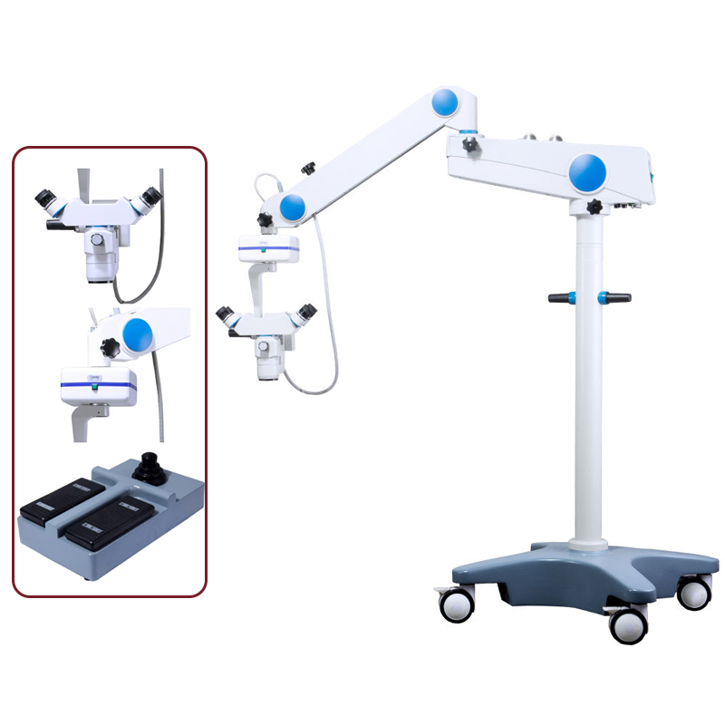 This surgical microscope offers a powerful 3-step magnification changer (6x, 10x, 16x) paired with a 200mm objective lens for crystal-clear views. It features a high-brightness binocular tube and fiber optic illumination with adjustable 0-60000LUX intensity and red reflex. Designed for clinical flexibility, the floor stand provides an 1100mm arm extension and includes a 6-function foot switch for hands-free control. Ideal for ENT and operating rooms requiring precise optics and robust build.