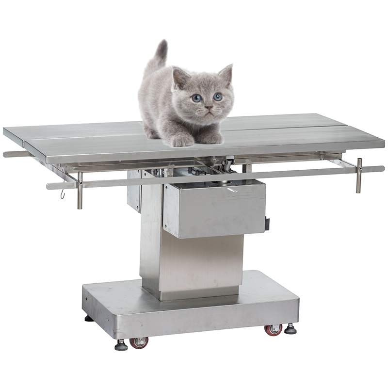 This electric pet operating table features full motorized control for effortless height adjustment, Trendelenburg, lateral tilt, and dual-tabletop plates each tilting 45° independently. Constructed entirely from 304 stainless steel, it ensures durability and easy cleaning. Includes removable surgical tray, sewage drain hole, medical dirt cup, height-adjustable infusion stand, and silent wear-resistant wheels for smooth mobility.