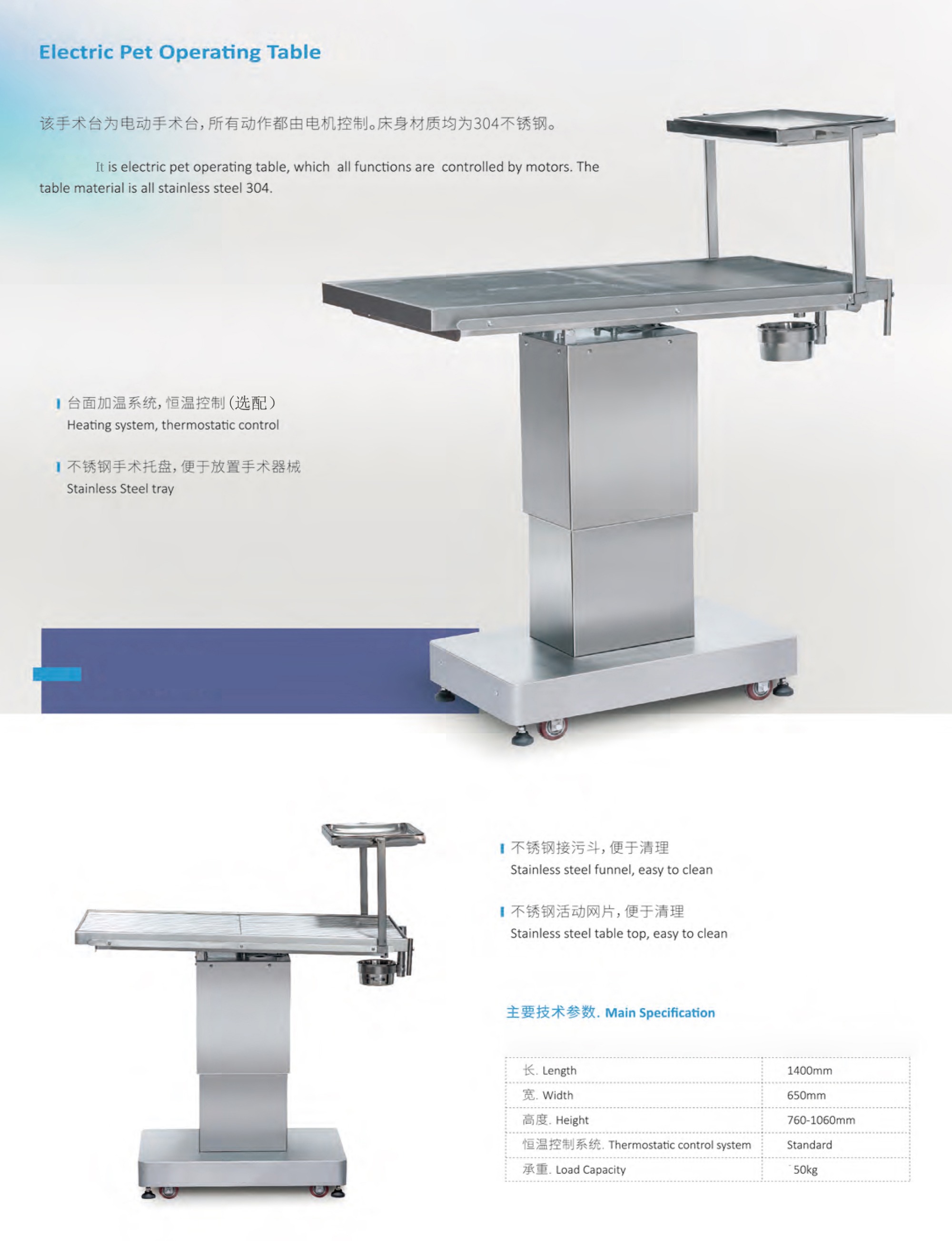 It is electric pet operating table, which all functions are controlled by motors. Thetable material is all stainless steel 304.Heating system, thermostatic control. Stainless Steel tray. Stainless steel funnel, easy to clean. Stainless steel table top, easy to clean.