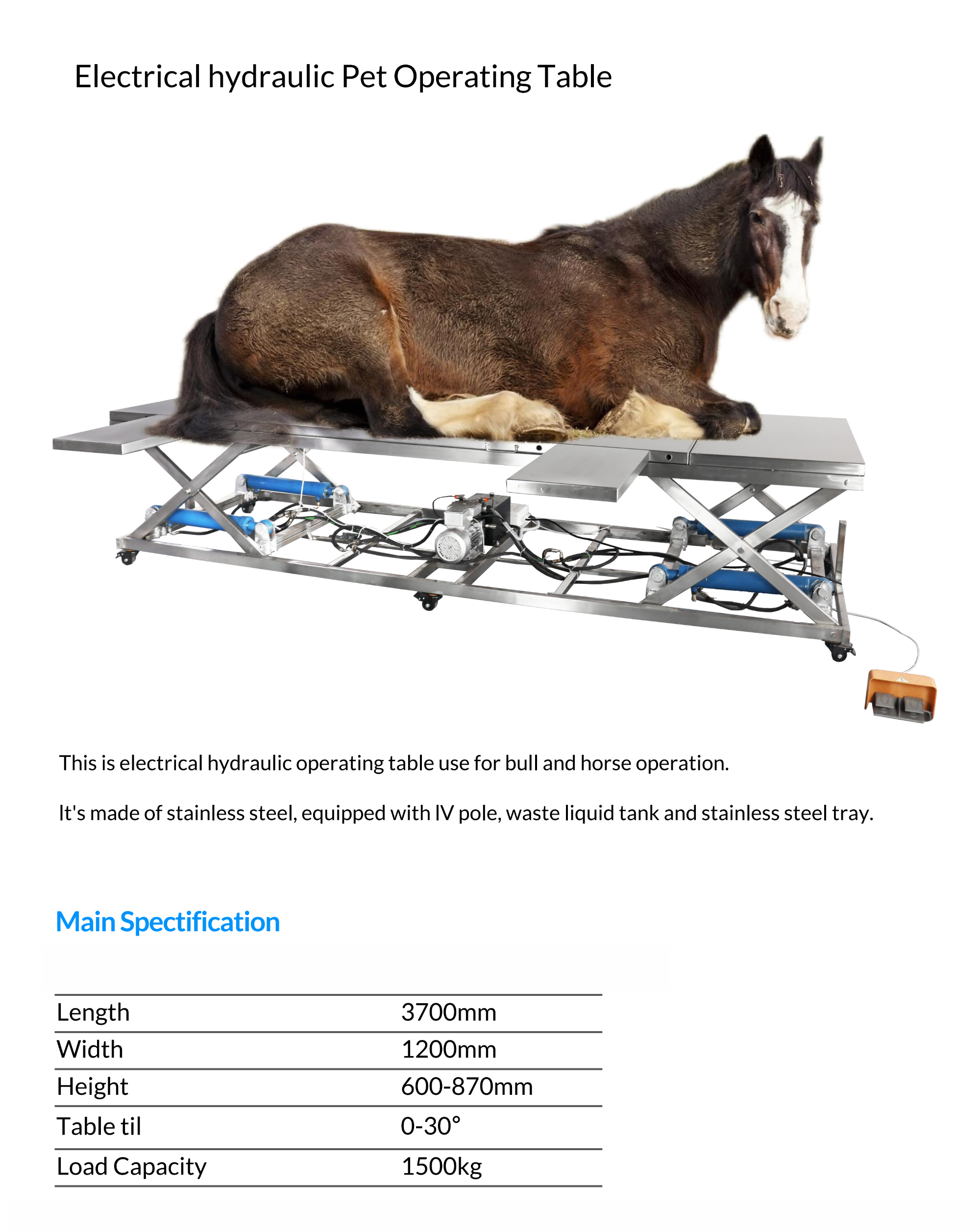 This electrical hydraulic operating table is designed for large animals such as bulls and horses, with a 1500kg load capacity. Constructed from durable stainless steel, it features foot pedal control for smooth lift and lowering. Equipped with IV pole, waste liquid tank, stainless steel tray, and four detachable leg supports. Universal brake wheels ensure easy mobility and stability.