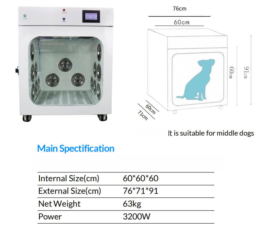 Automatic pet dryer room is cabinet type. It is used for pets drying and air-shower
