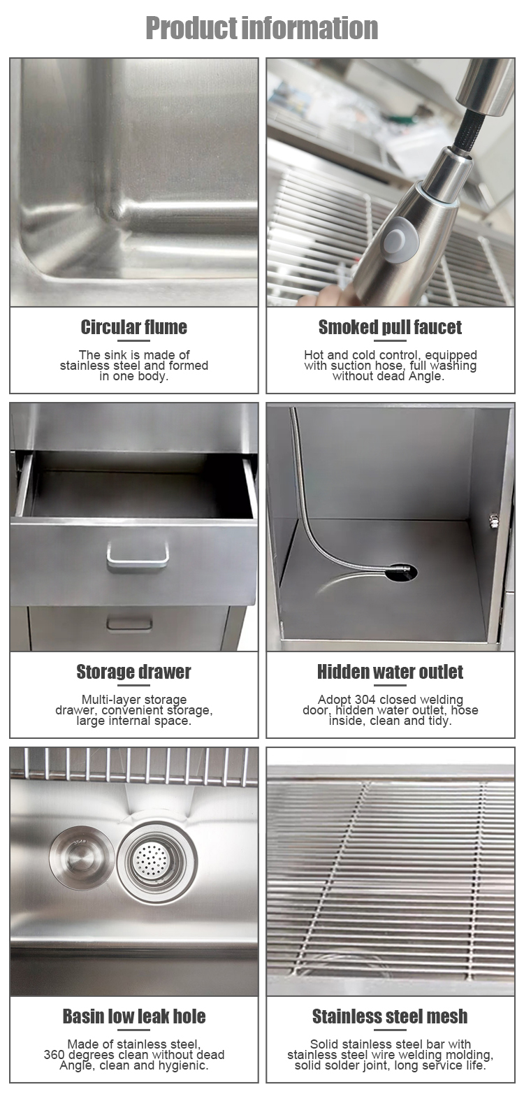 This stainless steel beauty table is crafted from high grade 304 stainless steel, offering exceptional durability and hygiene. The integrated circular flume features a smoked pull faucet with hot and cold control, ensuring a 360° clean without dead angles. Designed for efficiency, it includes a multilevel storage drawer, hidden water outlet, and stainless steel mesh for reliable drainage.