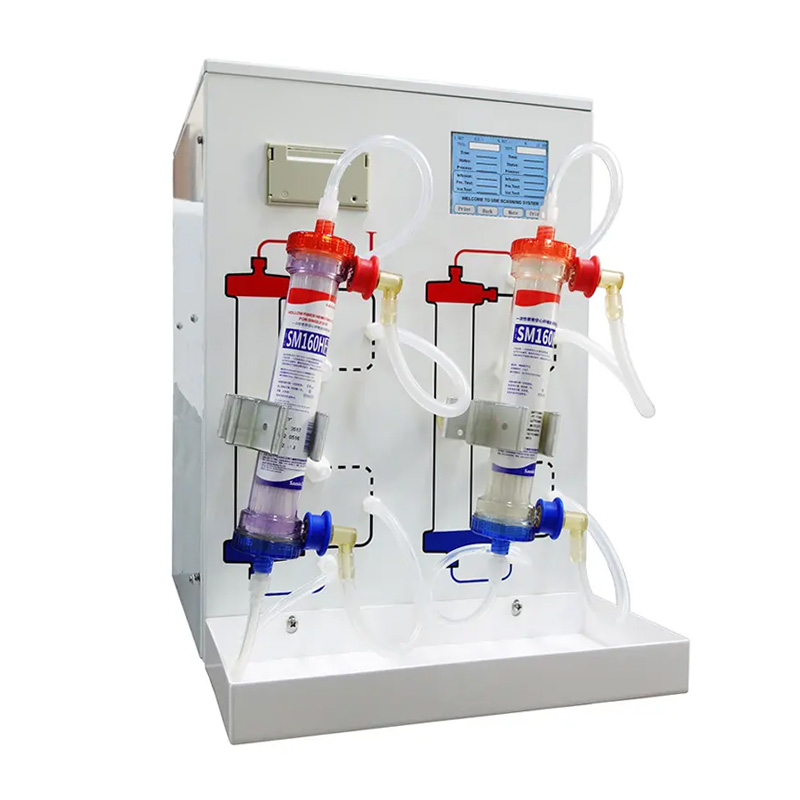 This dialyzer reprocessing machine is designed for hospitals and dialysis clinics to safely and efficiently reuse dialyzers. It can reprocess one or two dialyzers at the same time to improve efficiency. The system features automatic disinfectant dilution for accurate concentration and safe operation. A built in printer supports clear records including case number date and time. Anti cross infection connectors help reduce contamination risk between patients. The machine is compatible with different disinfectants and provides reliable performance for dialysis centers.