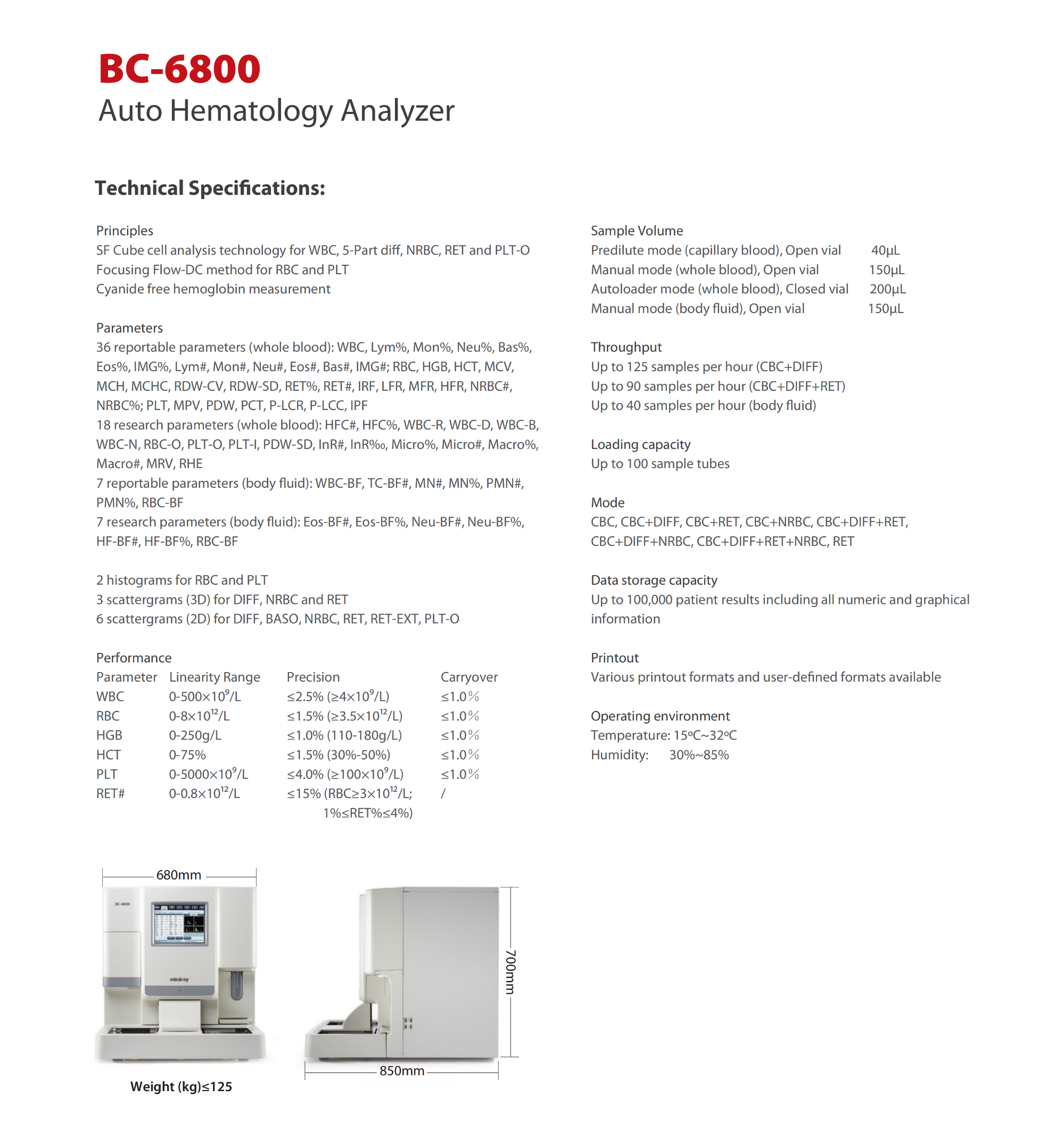 Mindray BC‑6800 Hematology Analyzer 5 Part Differential CBC Blood Testing System with Efficient Workflow