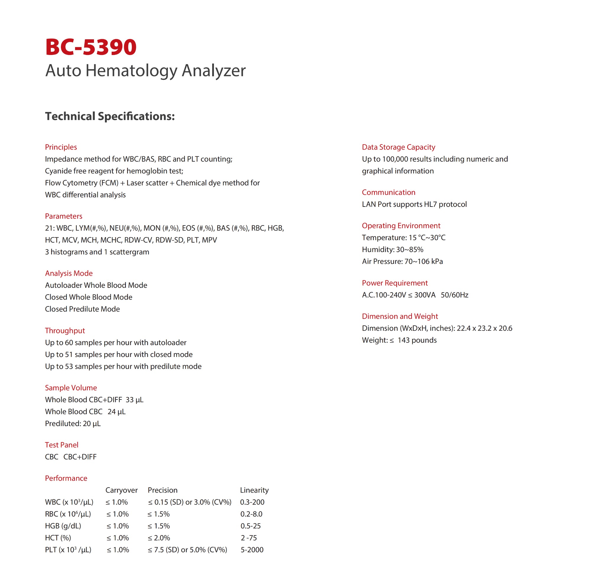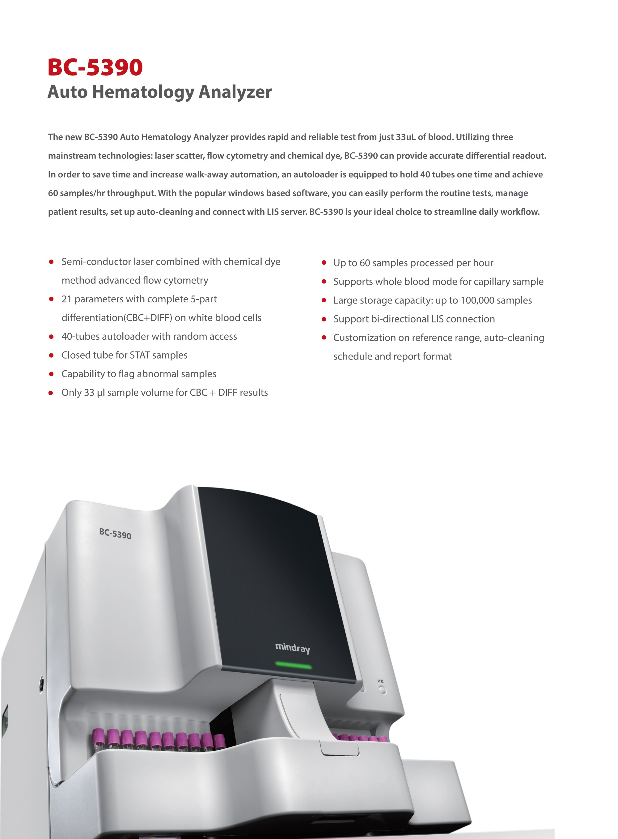 The Mindray BC-5390 Automated Hematology Analyzer is a 5-part Auto Hematology Analyzer that delivers high productivity, better accuracy, and improved patient care, without sacrificing your budget.