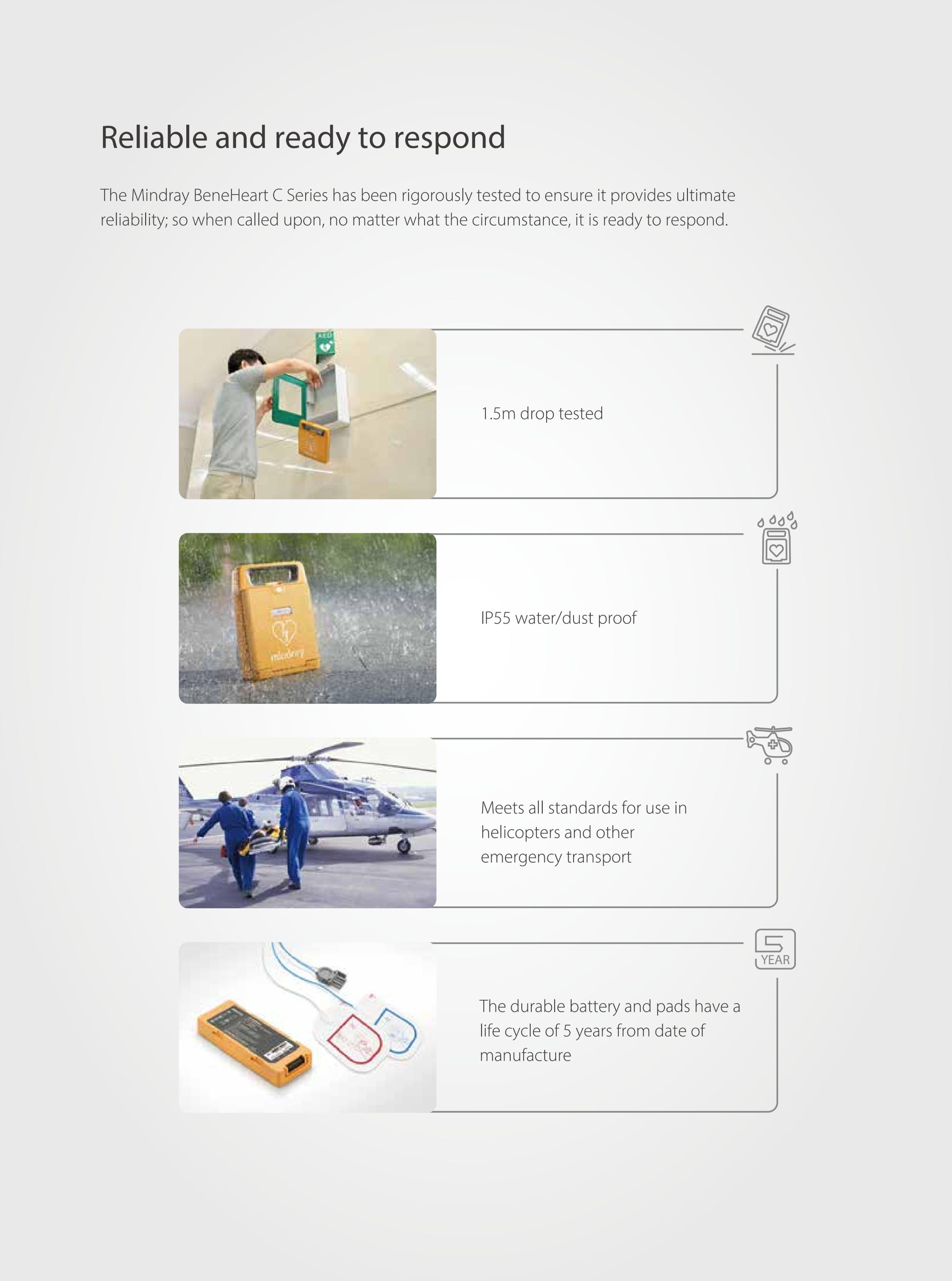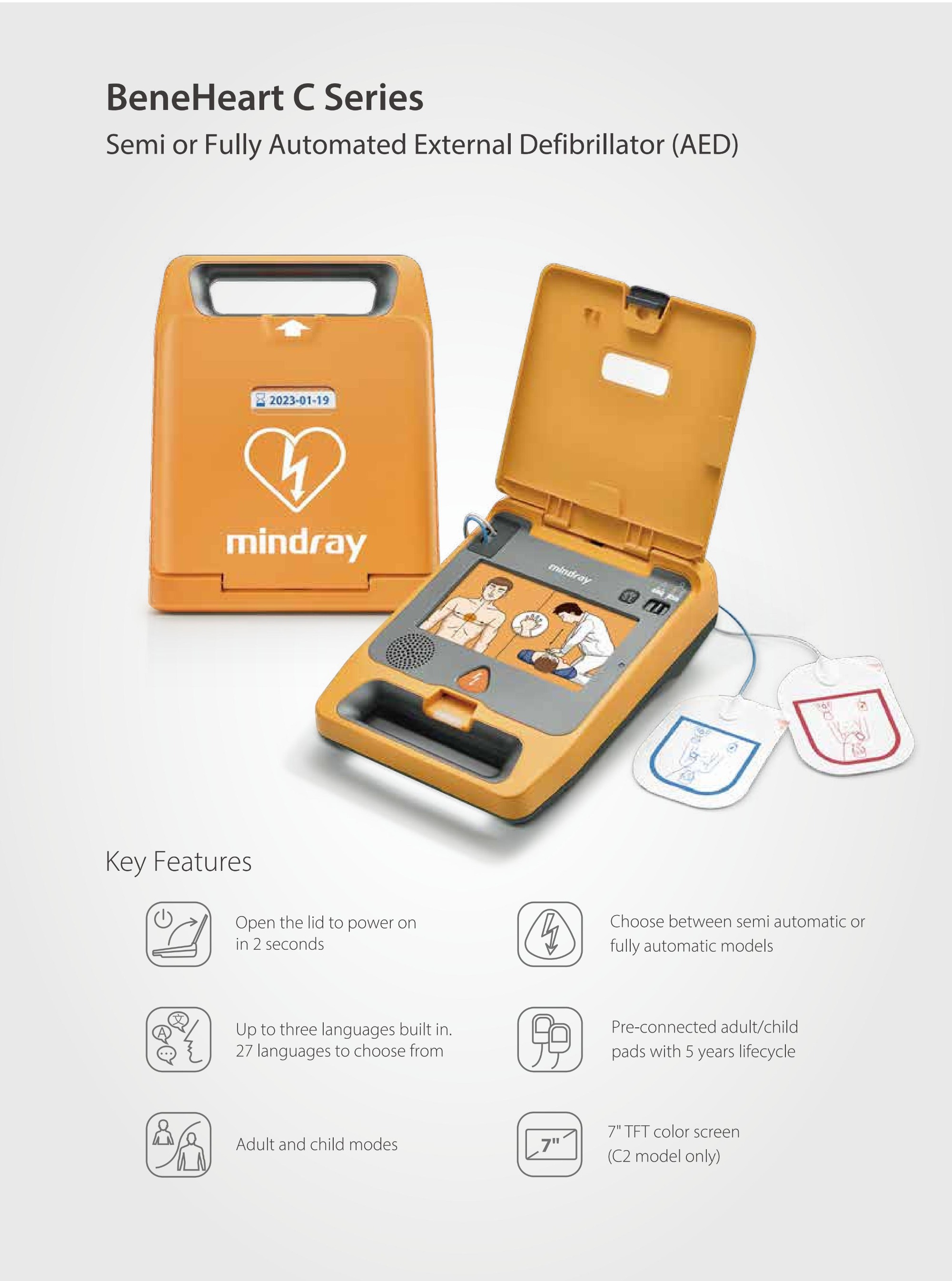 Mindray BeneHeart C Series, the portable heart defibrillators, knows what a first-timerescuer needs, we have Mindray BeneHeart C1A and Mindray BeneHeart C2 for you tochoose.