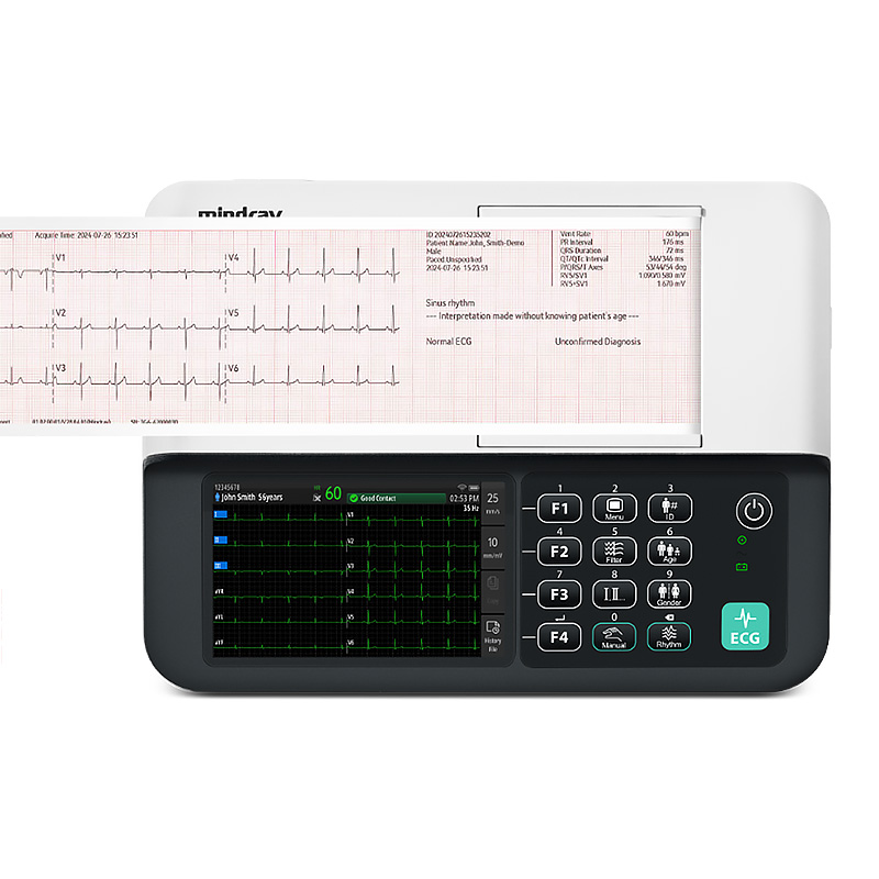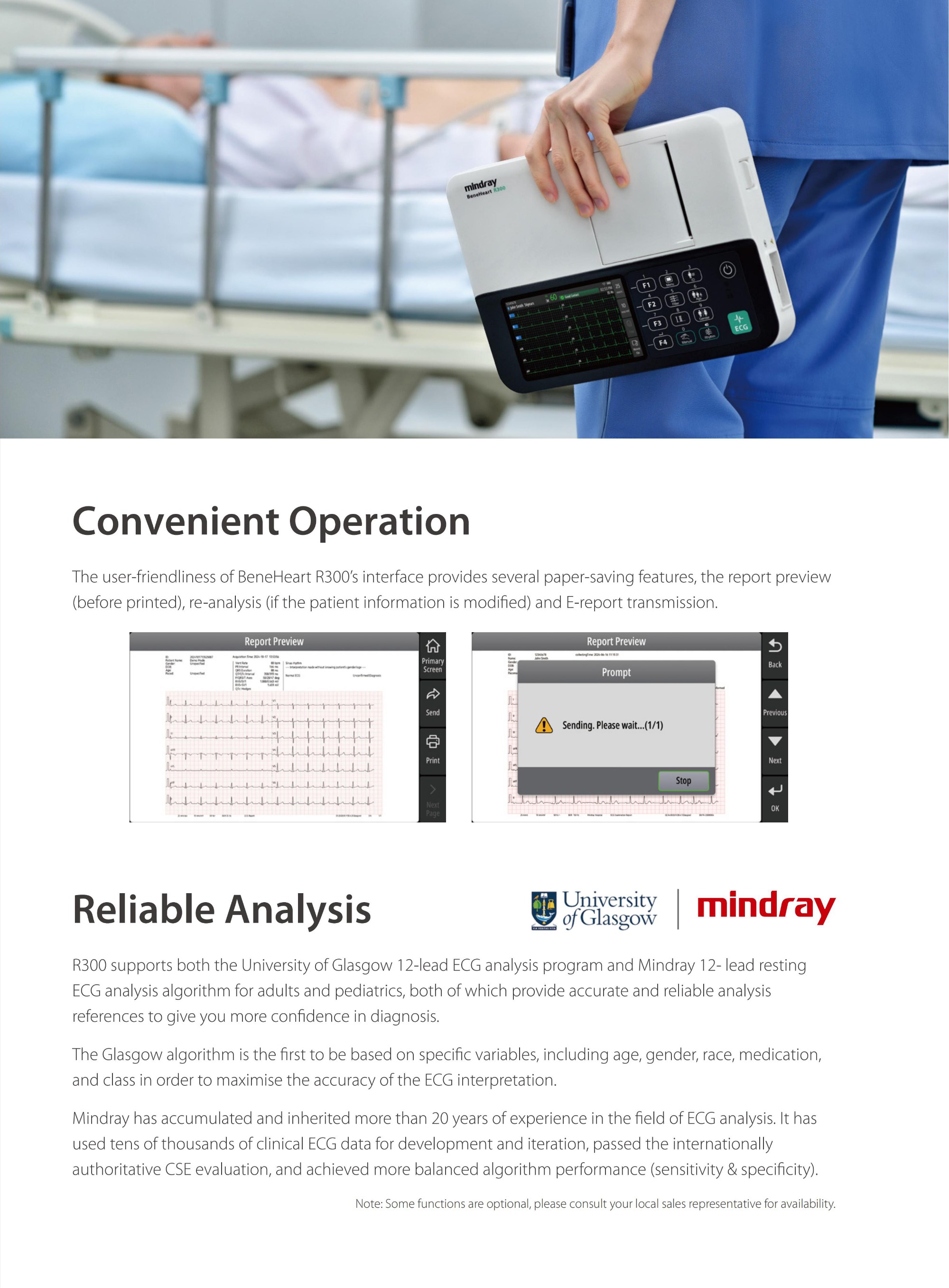 The Mindray BeneHeart R300 is a compact 12-lead ECG machine designed for accurate cardiac diagnostics. It features a 5-inch color display for real-time waveform viewing, lightweight portable design (about 1.28 kg), and storage for over 1000 reports. With advanced ECG analysis algorithms including Glasgow and Mindray, plus electronic report transmission and seamless data integration, it enhances diagnostic confidence and workflow efficiency.