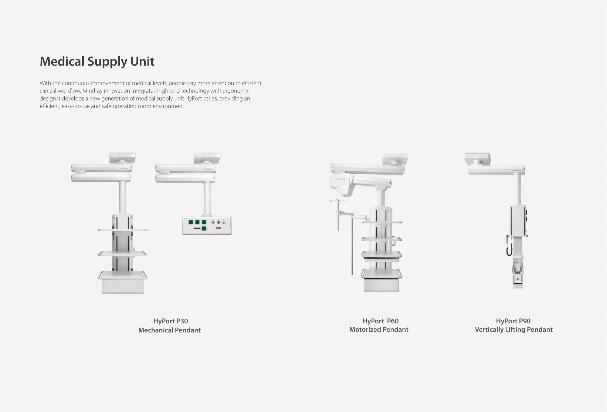 The Mindray HyPort P30/P60/P90 is a ceiling-mounted surgical pendant system offering modular design and flexible configuration. It provides reliable support, multi-function connectivity, and efficient integration in operating rooms for streamlined workflows and improved clinical performance.