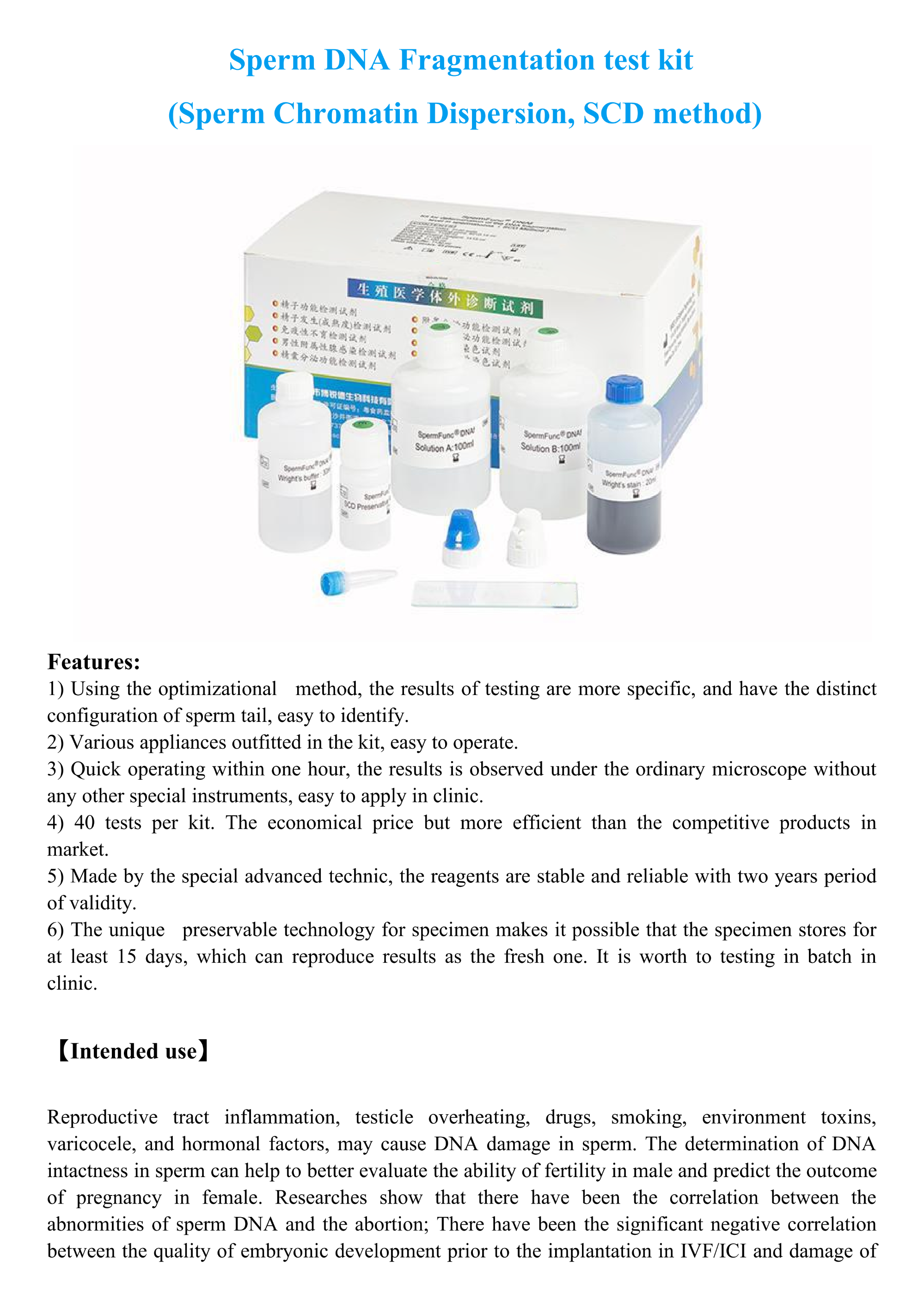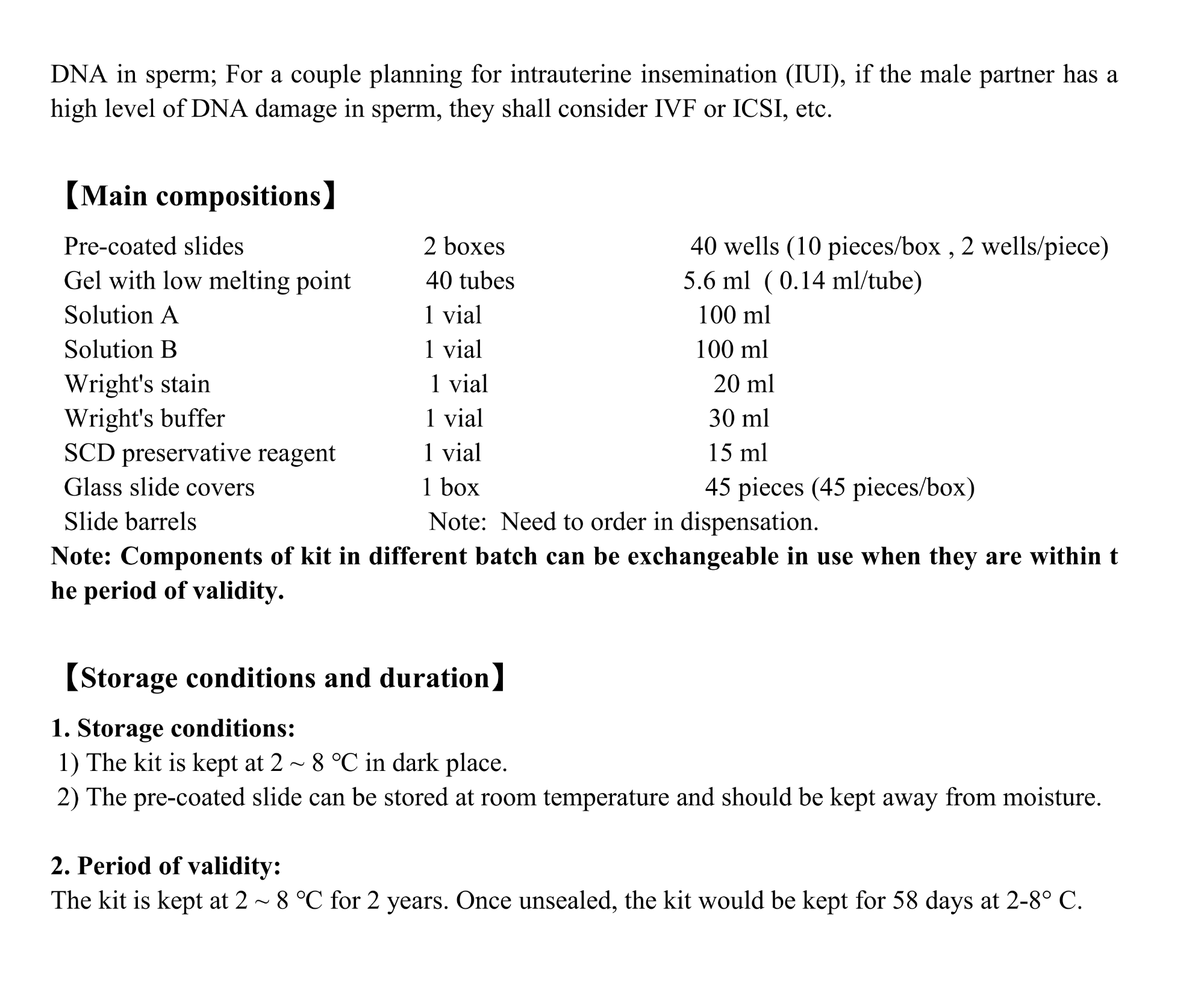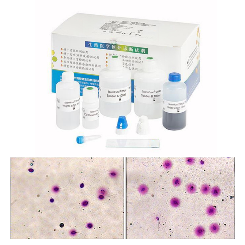 This sperm DNA fragmentation test kit offers precise and easy-to-read results with clear sperm tail visualization. The kit includes all necessary tools, allows testing within one hour under a standard microscope, supports 40 tests per kit, and uses stable reagents with two-year shelf life. Unique preservable technology allows specimens to be stored up to 15 days with reproducible results, making it ideal for clinical fertility assessment and research.