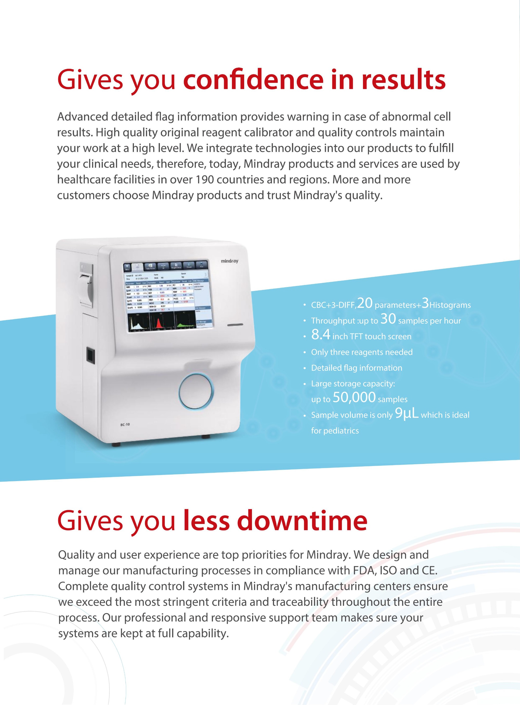 Mindray BC-10 is a compact and efficient 3-part differential hematology analyzer for routine CBC testing. It delivers accurate results, easy operation, low maintenance, and reliable performance, ideal for small labs, clinics, and healthcare facilities.