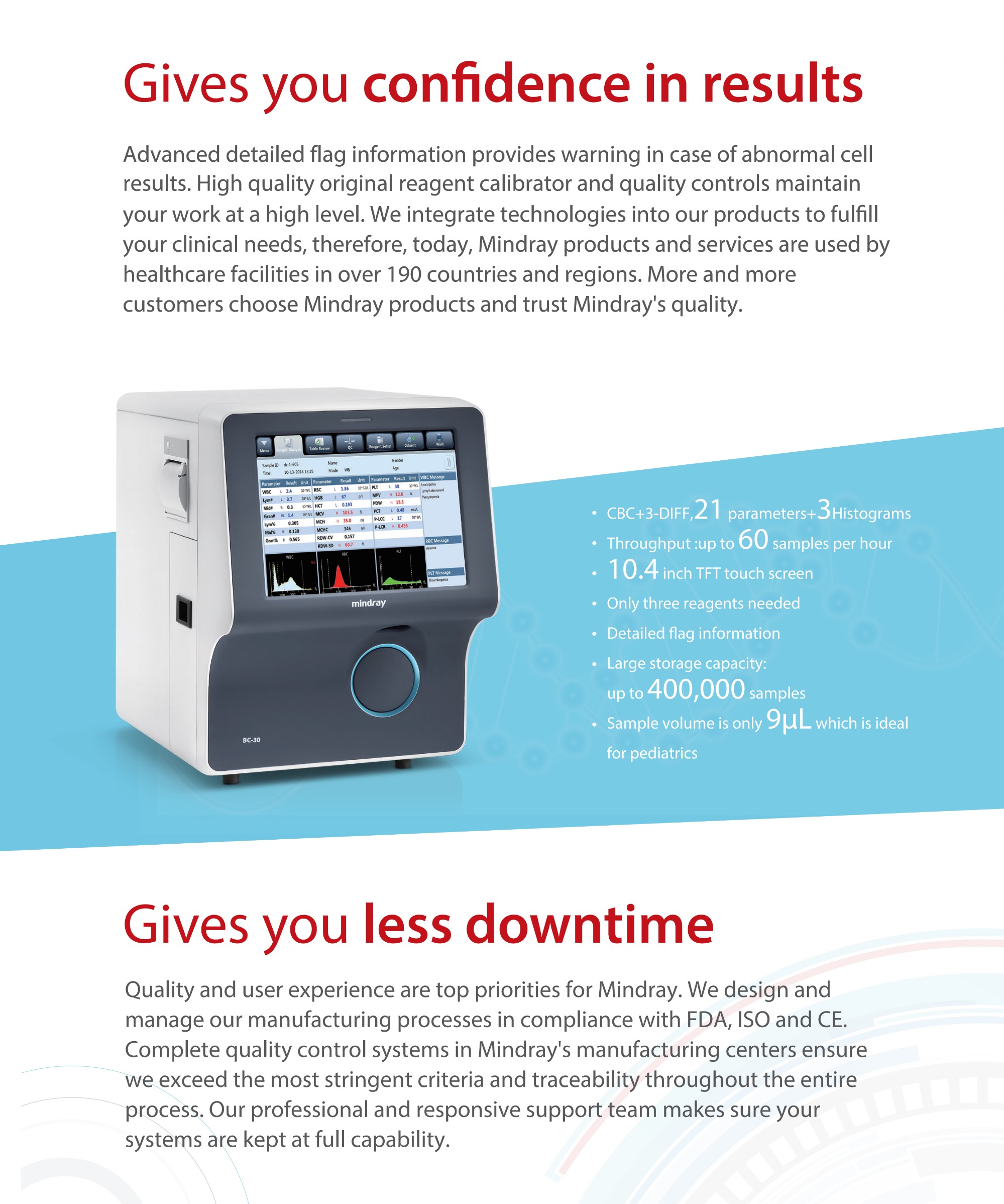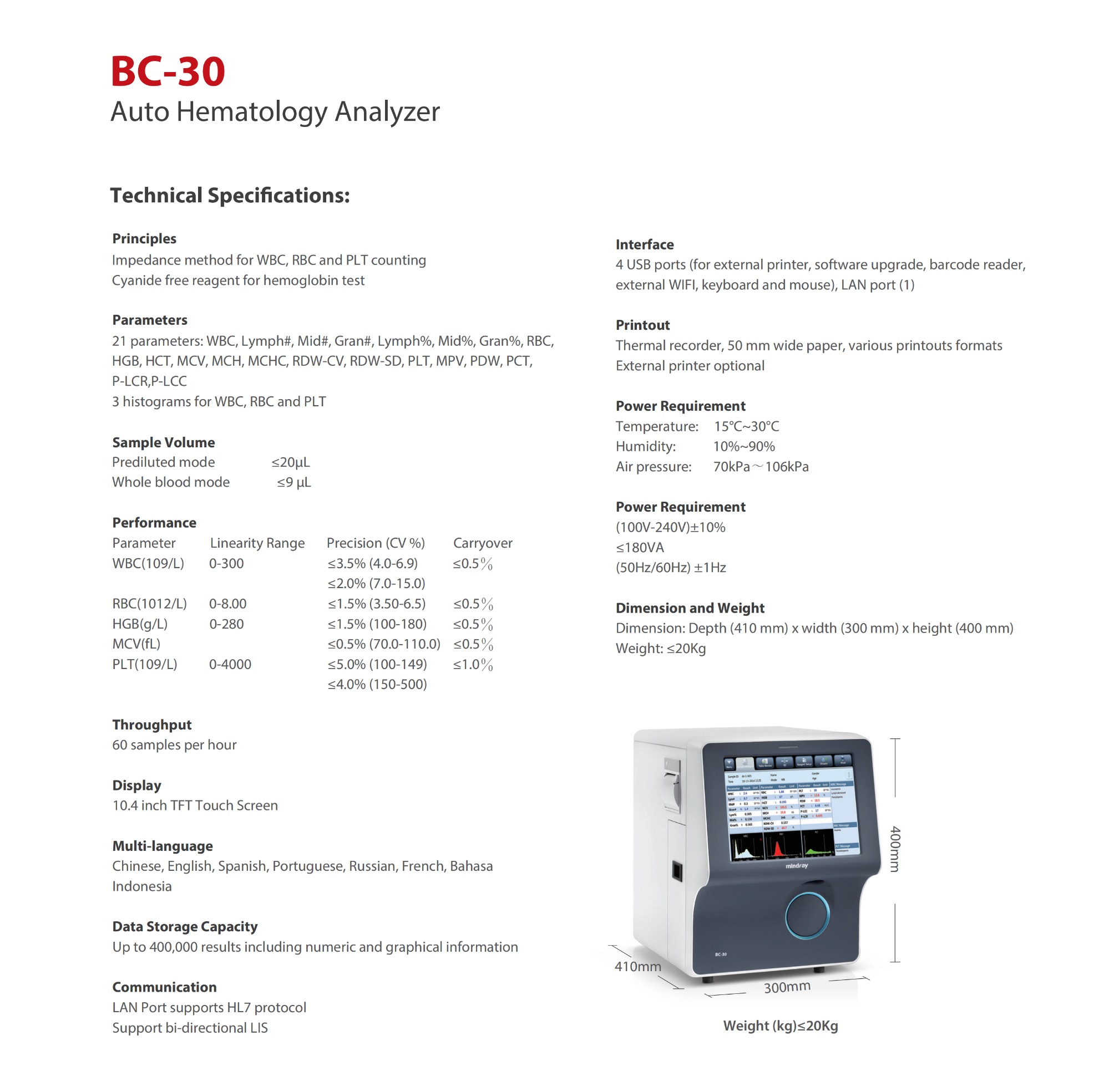 Mindray BC-20s Auto Hematology Analyzer 3-Part Differential CBC Blood Cell Counter for Laboratory