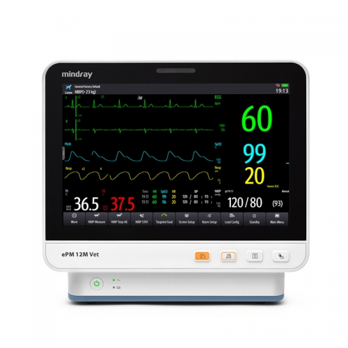 Mindray ePM 12M Vet is a veterinary multiparameter patient monitor for clinics and hospitals. It provides accurate ECG, SpO2, NIBP, respiration, and temperature monitoring, ensuring reliable real-time vital signs observation for animals.